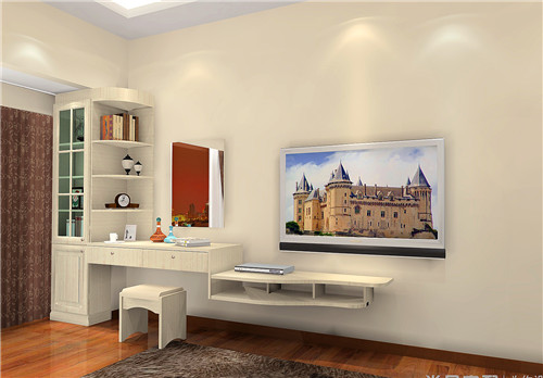 设计亮点:阶梯式的组合柜,实用性一流,从左到右依次是收纳柜、梳妆台、电视柜。