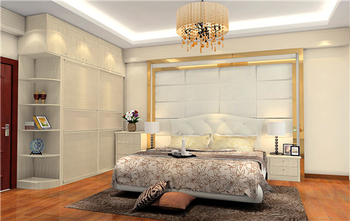 设计亮点:百叶门板造型的到顶衣柜,消灭了房间的梁柱,其转角圆弧柜的设计也增添了衣柜的多功能性。